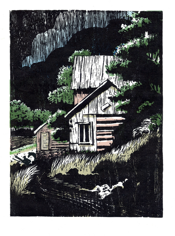 Forest shack before thunderstorm